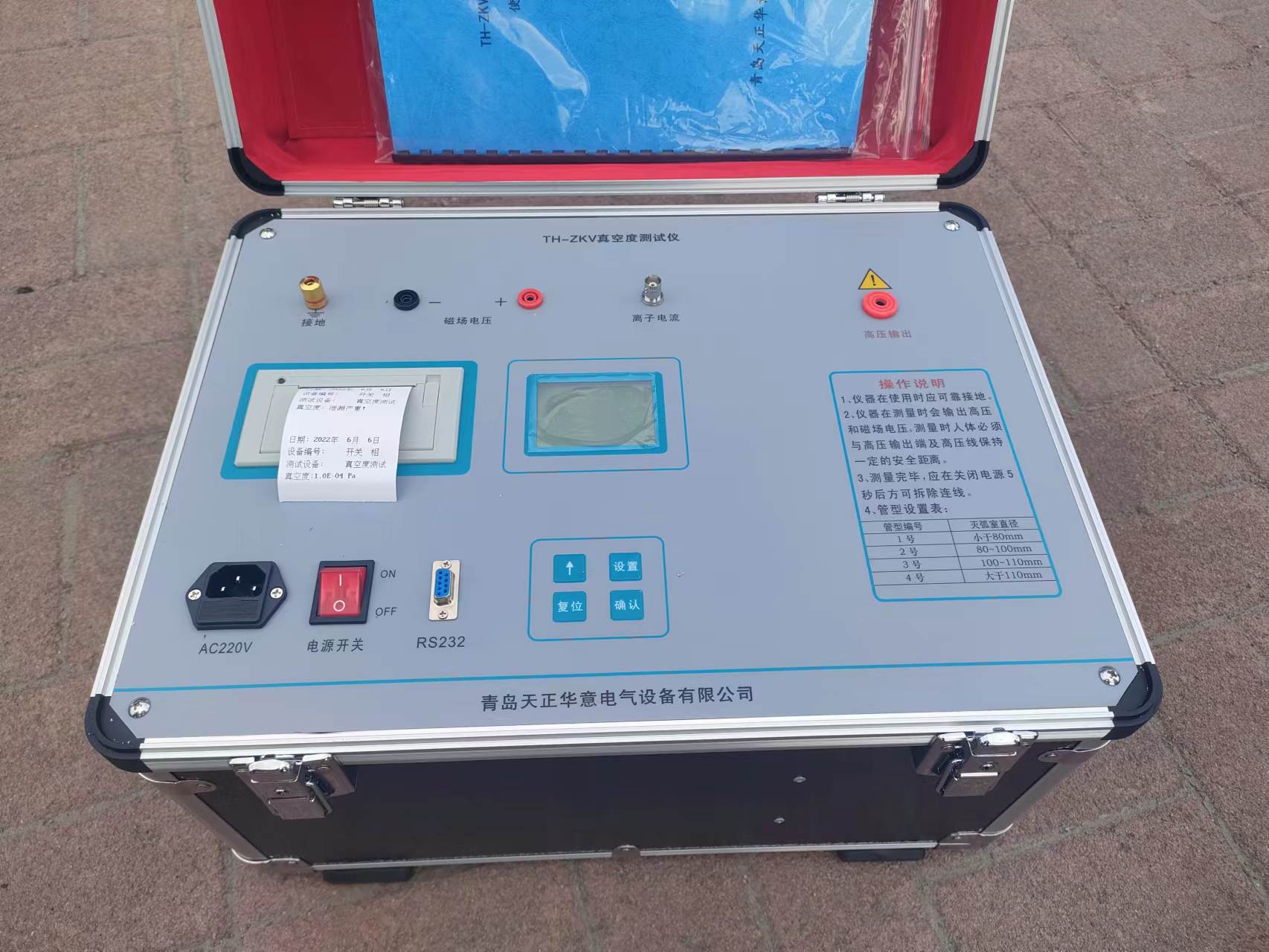 鐵嶺真空度開關(guān)測(cè)試儀真空度測(cè)試儀使用說明書青島天正華意電氣設(shè)備有限公司章規(guī)則及注意事項(xiàng)請(qǐng)您在使用真空度測(cè)試儀前仔細(xì)閱讀本手冊(cè)。?在開機(jī)之前請(qǐng)先接好所有測(cè)試連接線,如打印機(jī)連接線;?測(cè)量前,請(qǐng)檢查管型是否適合所檢測(cè)的真空管,以便準(zhǔn)確測(cè)量。?開機(jī)、關(guān)機(jī)及測(cè)量時(shí),不要觸及高壓線和磁控電流線,以防觸電。?儀器在使用過程中,如發(fā)現(xiàn)線圈發(fā)出異常響聲,應(yīng)考慮測(cè)試線短路或接觸不良,或者空氣十分潮濕,或真空斷路器表面罩有灰塵等因素。?請(qǐng)不要使用汽油、香蕉水等化學(xué)劑擦拭機(jī)器,而應(yīng)使用柔軟干燥的布。?請(qǐng)確認(rèn)當(dāng)?shù)仉娋W(wǎng)電壓是否與本機(jī)供電電壓相符。交流220±10% 50/60HZ?請(qǐng)注意不要在雷雨的情況下使用機(jī)器。?請(qǐng)不要破傷隨機(jī)所帶的線纜,以確保使用。?儀器出現(xiàn)故障時(shí),非本公司專業(yè)技術(shù)人員嚴(yán)禁擅自打開儀器進(jìn)行檢修。?嚴(yán)禁高壓端直接或間接對(duì)地?cái)嗦?。第二章儀器簡介真空度測(cè)試儀是真空滅弧室的真空度的鑒定設(shè)備。經(jīng)研究所檢驗(yàn)并出具合格。